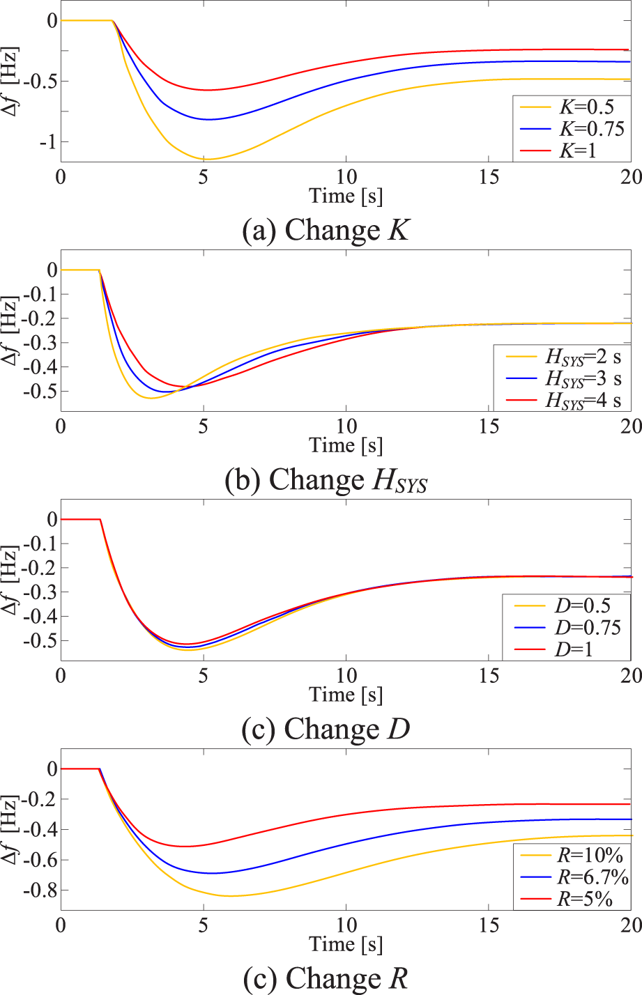 (A) Change K. (B) Change HSY. (C) Change D. The characteristic of system frequency response.