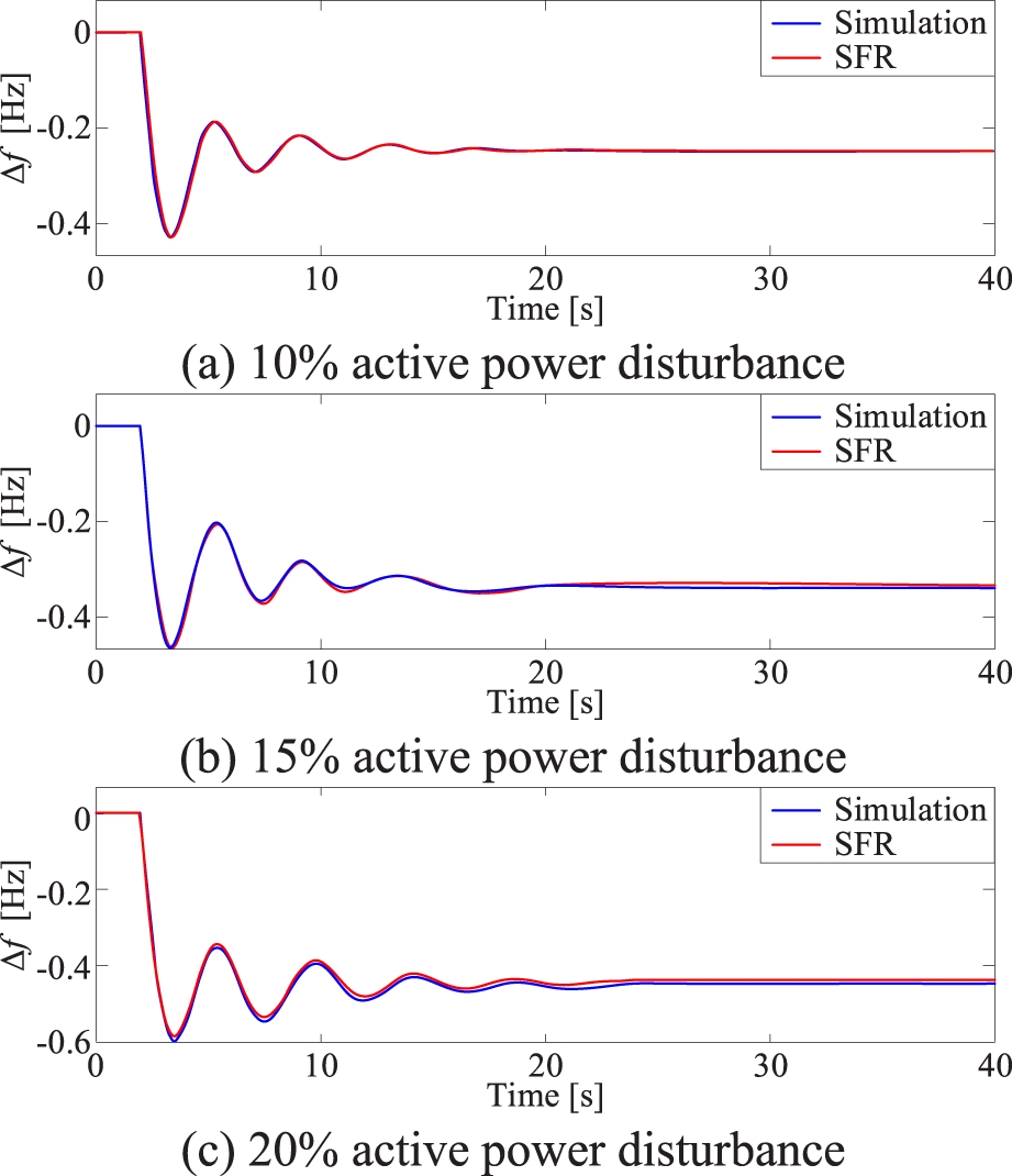 From the above figure and table, it can be observed that the output of the SFR model closely matches the results of the time-domain simulation under various load increment scenarios. Even in the case of 20% load increment, which caused a frequency drop of 0.46Hz, the error in the minimum frequency value was only 2.377%. These simulation results convincingly demonstrate the effectiveness of the proposed SFR model.