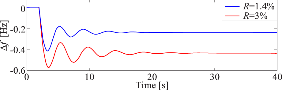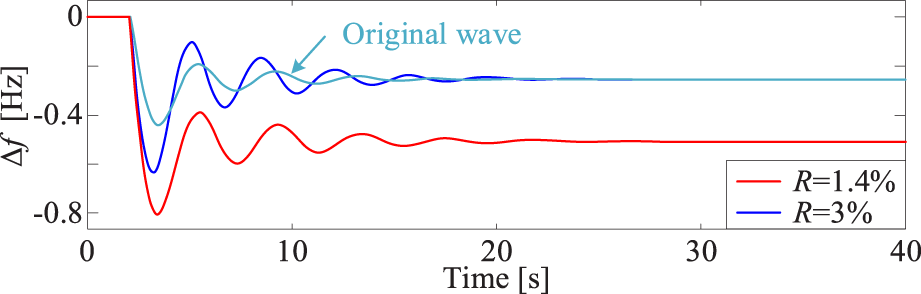 Accordingly, the equivalent droop coefficient of the system, R′ can be expressed by Equation 8: where ΔR represents the variation in the equivalent droop coefficient of the system after it has been partially replaced by non-synchronous power sources.