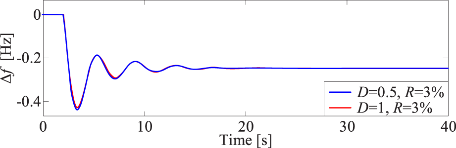 According to Figure 9C, changes in D primarily impact the system maximum frequency deviation. A smaller D results in a larger maximum frequency deviation. While Equation 14 indicates that D also influences the quasi-steady-state frequency deviation, this effect is generally limited due to the typically small damping coefficients in power systems.