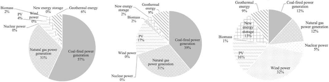 Figure 6. Installed capacity structure of out-of-city power sources in Shanghai in 2022, 2030 and 2060.