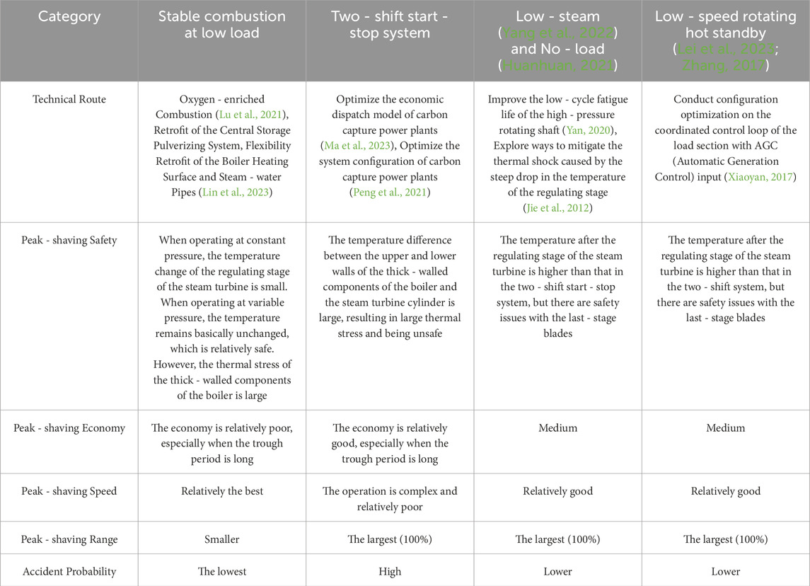 Based on the current situation of thermal power units in Shanghai and the peak - shaving requirements, this paper summarizes the research trends of the existing thermal power units’ “Simultaneous Implementation of Three - pronged Retrofits” participating in system peak - shaving. The modeling approaches underpinning these strategies include AGC (Automatic Generation Control) optimization models for load coordination, economic dispatch models considering carbon capture, and thermal stress analysis models for variable pressure operation. We analyzes the five - dimensional comparison of the safety, economy, peak - shaving speed, peak - shaving range, and accident probability of the four formed peak - shaving modes, as shown in Table 2.