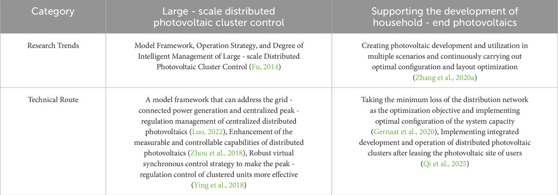 Therefore, based on the current situation of distributed photovoltaics in Shanghai and the peak - regulation requirements, this paper summarizes the current research trends of centralized peak - regulation management and power distribution of existing clustered distributed photovoltaics. Key modeling approaches include cluster control models for distributed PV systems, robust virtual synchronous control strategies, and optimal capacity allocation models minimizing distribution network losses. We analyzes the technical routes and effect presentations of the two formed peak - regulation modes, as shown in Table 3.