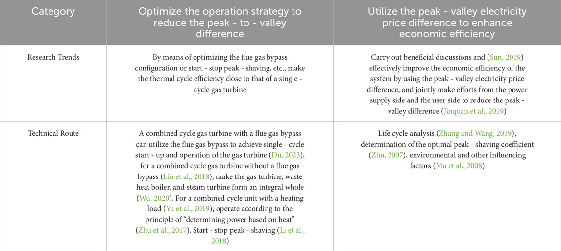 Natural - gas Distributed Energy Supply, as a new - type kinetic energy system and utilization method, is widely used due to its advantages such as rapid start - up and shutdown, high - efficiency, environmental - friendliness, and being closer to users (Sun et al., 2025), and it has entered a stage of rapid development. Taking Copenhagen, Denmark as an example, natural gas distributed energy accounts for over 40% of its district energy system. Through waste heat recovery and cold storage echnologies, the system achieves an overall thermal efficiency exceeding 90%, successfully reducing peak grid load by approximately 15% during winter heating peaks. For gas turbine units, simple cycle gas turbines have almost no minimum technical output limitation. Technically, the peak - shaving depth is close to 100%, and the adjustment speed is fast. Natural gas distributed energy projects belong to the clean energy projects that are strongly supported and encouraged to develop by the state and this city. These projects achieve cascaded utilization of energy, and the comprehensive thermal efficiency can reach more than 70%. In regional natural gas distributed energy supply systems, the operation of prime movers such as internal combustion engines or gas turbines is relatively stable, and the amount of residual heat they generate is also stable. The cooling capacity prepared by hot water lithium bromide units using the residual heat is also relatively stable (Sun et al., 2022). The storage of surplus cooling capacity takes into account both energy utilization rate and economic benefits (Ma, 2023). Based on the current situation of gas - steam combined cycle gas turbines in Shanghai and the peak - shaving requirements, this paper summarizes the current research trends of improving the peak - shaving capacity of gas - steam combined cycle gas turbines and forms a comparison from research perspectives, as shown in Table 4.