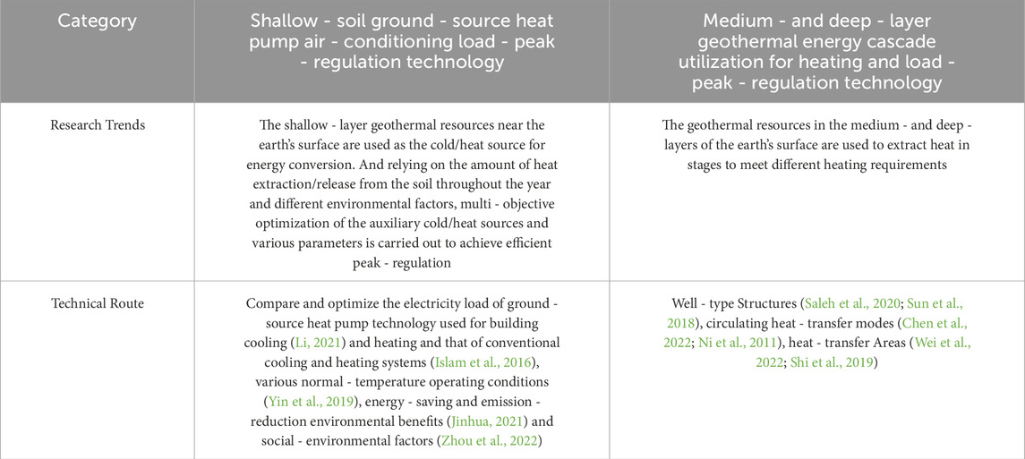 Geothermal energy is a type of renewable energy. Through ground - source heat pump technology, it is used for building cooling and heating. Compared with conventional cooling and heating systems, it can effectively reduce the electricity load for building cooling and heating (Yang, 2013). According to research (Zhang, 2022), the full utilization of low - grade energy such as geothermal energy is expected to increase the regional electrification level by about 20% and reduce the regional load peak - to - valley difference rate by more than 5%. Based on the current development status of geothermal energy in Shanghai and the peak - regulation requirements, this paper summarizes the current research trends of improving the peak - regulation capacity of geothermal energy development and forms a comparison from subdivided research perspectives, as shown in Table 5.