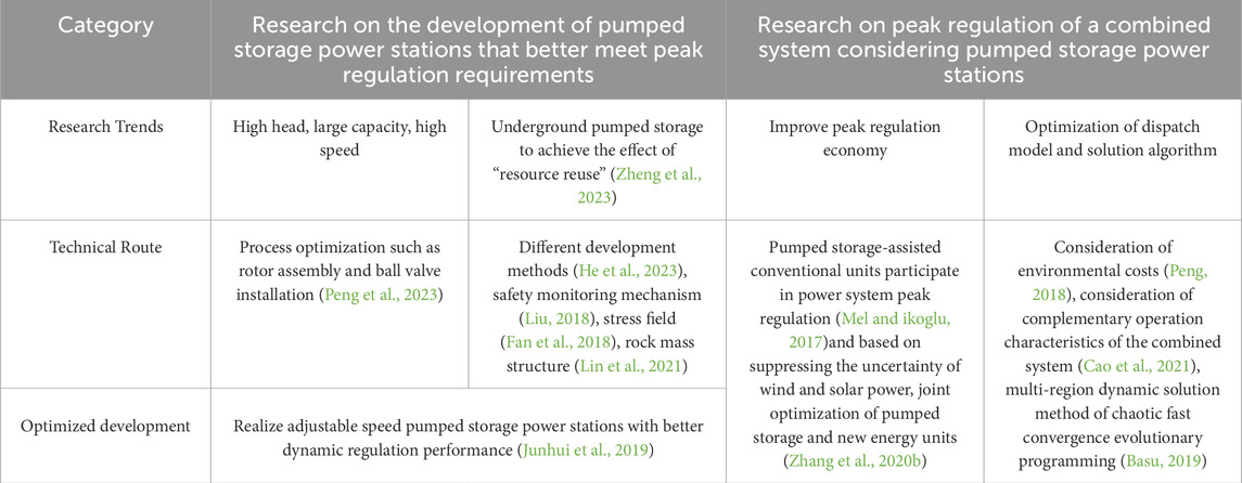 Pumped storage power stations in physical energy storage have a relatively wide range of capacity provision thresholds (with installed capacity mostly between 300,000 and 2 million kilowatts), possess relatively complete functions (including peak regulation, frequency modulation, voltage regulation, reserve capacity, black start, peak shaving and valley filling, etc.), have excellent regulation characteristics (in terms of regulation speed, they can reach full output operation from a static state within hundreds of seconds; in terms of peak regulation ability, they can provide deep peak regulation ranging from 0% to 220%), enjoy superior environmental protection benefits (as they do not directly generate carbon emissions), have a high level of technological maturity (having achieved commercial applications long ago), and good economic benefits (with a capacity cost of about 100 yuan/kWh, which has an absolute advantage among energy storage methods and a cost per kilowatt-hour reduced due to the scale effect to 0.3 yuan/kWh). They are widely used. The Anji Pumped Storage Power Station in Zhejiang, China, boasts an installed capacity of 1.8 million kilowatts. During the peak period of the East China Power Grid in summer 2022, through rapid response dispatch, it successfully reduced peak load by approximately 1.5 million kilowatts, effectively lowering the grid’s peak-to-valley difference ratio by about 5%. Based on the current development status of pumped storage in Shanghai and the peak regulation requirements, this paper summarizes the current research trends of pumped storage for peak regulation applications. Modeling approaches include dynamic economic dispatch models integrating pumped storage with renewable energy, chaotic fast convergence algorithms for multi-region scheduling, and environmental cost-inclusive optimization models. We form a comparison of subdivided research perspectives and a summary of the technical transformation routes for optimized development, as shown in Table 11.