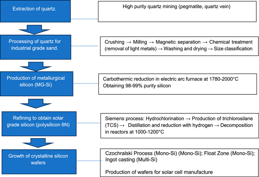 For the development of solar cells, industrial-grade quartz sand with a purity of at least 95% is required, obtained from natural quartz deposits. Once extracted, the quartz undergoes a crushing process to reduce its size and facilitate subsequent processing. Next, grinding is performed, during which the material is converted into finer particles. Magnetic separation is then applied to extract ferrous elements, followed by the addition of chemical reagents to remove light metals such as aluminum and titanium. Finally, the material is washed with water and dried in ovens or under the sun before being classified according to its size (Zhang et al., 2023).