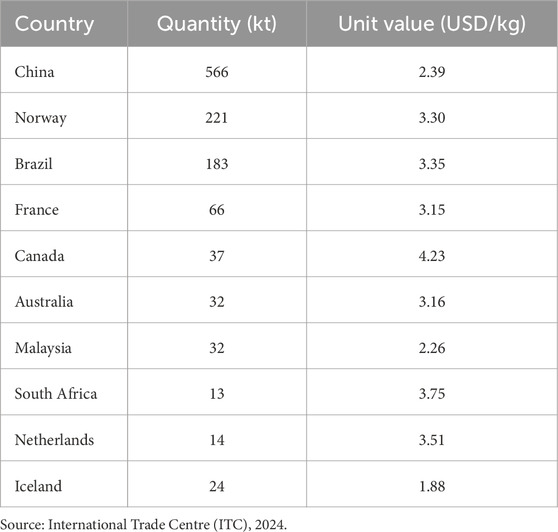 China produces nearly 80% of the solar-grade polysilicon used in the creation of solar modules. In the coming years, this demand is expected to grow significantly alongside solar energy (Heidari and Anctil, 2022). In this regard, only a few countries can achieve this scale, with China being the leading producer of metallurgical silicon: it produces approximately 6 million metric tons of this material, controlling about 70% of the global market for this type of silicon (Table 2). Russia and Brazil follow, with productions of 640,000 and 400,000 metric tons, respectively (U.S. Geological Survey, 2023). Most of the production is used domestically, while around 10% is exported. Although China dominates the MG-Si market, its main weakness lies in the lack of large deposits of high-quality quartz.