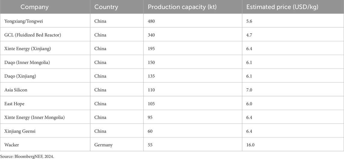 Historically, silicon (Si) has had diverse uses, ranging from optics to construction. However, since World War II, new physical and chemical processes for purifying this element have been developed, making it one of the main components in the electronics, semiconductor, and renewable energy industries due to its chemical, electrical, thermal, and mechanical properties (Vatalis et al., 2015). In the case of the photovoltaic solar industry, high-purity silicon known as solar-grade is required. This is the central element of solar cells and controls approximately 97% of the market (Heidari and Anctil, 2022). While silicon is the second most abundant material on the planet, the type of silicon required for solar cells must meet specific conditions, primarily obtained from quartz mines with high purity levels or through industrial processing Table 1. Considering that deposits of this type of quartz are scarce, it becomes a strategic resource, creating tension between the growth of solar energy and the technical-economic processes necessary for its development (Pan et al., 2022).