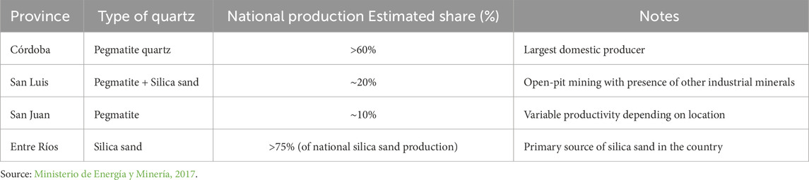 Different types of pegmatites can be found in Córdoba. Among the most important areas are Altautina, Alta Gracia, Punilla, and Comechingones, where both the types of mines and the quality of the quartz vary significantly (Galliski and y Sfragulla, 2014). In the province of La Rioja, the Sierra Brava area contains open-pit mines that operate on an artisanal scale with low productivity. In San Juan, the Valle Fértil and Sierra Pie de Palo regions host mines with varying productivity levels. Meanwhile, San Luis has two significant zones—Totoral and Conlara—both featuring high-productivity open-pit mines due to the presence of other valuable minerals (Galliski et al., 2022). In Catamarca, Salta, and Tucumán, the main deposits are located in the Ambato, Ancasti, El Quemado, and Quilmes areas. These are open-pit mines whose exploitation began in the mid-20th century and are characterized by low to medium productivity.