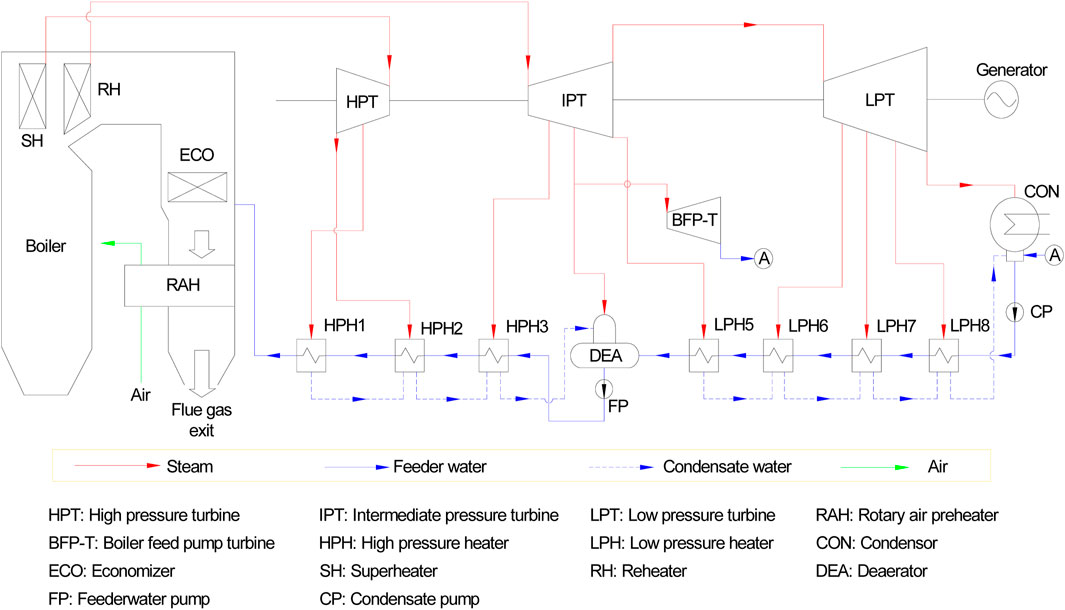 A 630 MW ultra-supercritical reheat coal-fired power plant in China is taken as the reference unit. The system diagram of the reference unit is shown in Figure 1. The boiler of the 630 MW unit adopts the supercritical transformer DC boiler with the model of HG-1970/25.4-PM18, the burner adopts the swirling pulverized coal burner with the front and back wall combustion mode, and the preparation system adopts the pulverized system of double inlet and double outlet steel ball mill. The steam turbine is a super-critical, single intermediate reheat, condensing steam turbine with model N630-24.2/566/566. The parameters under the different turbine heat acceptance (THA) condition of this stage group are shown in Table 1.