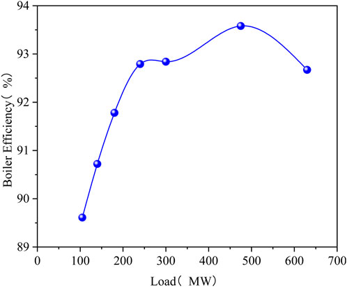 With the reduction of unit load, the loss and thermal efficiency of coal-fired boilers also decrease (Yue et al., 2023). When the unit is in the range of 630 MW–105 MW with wide load peak shaving, the variation of boiler thermal efficiency with unit load is shown in Figure 2.
