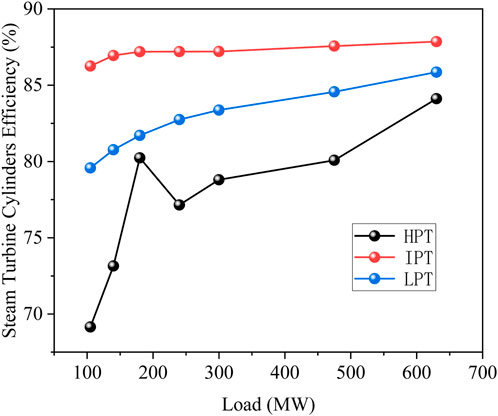 The change of steam turbine operating parameters has a certain degree of influence on the economic performance of steam turbine, which is mainly reflected in the change of cycle thermal efficiency and relative internal efficiency (Wang and Gu, 2023). According to the actual operating parameters of the unit under different working conditions, the efficiency of the turbine high, intermediate and low-pressure cylinders is calculated, and the results are shown in Figure 3.