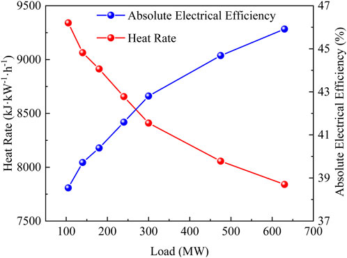 The steam turbine heat rate and absolute electrical efficiency of the unit are calculated according to the operating parameters, and the results are shown in Figure 4. The heat of the unit gradually increases with the decrease of the load. When the load of the unit is 630 MW, the heat rate is 7,840.32 kJ/(kW·h), and the absolute electrical efficiency is 45.92%. When the unit load is 300MW, the heat rate of the unit is 8,409.82 kJ/(kW·h), which is 569.5 kJ/(kW·h) higher than that of 630 MW and the absolute electrical efficiency is 42.81%, which is 3.11% lower than the 630 MW operating condition. When the load of the unit drops below 300 MW, the heat rate of the unit operation increases significantly, and the absolute electrical efficiency decreases greatly. When deep peak shaving is car-ried out, the heat rate and absolute electrical efficiency of the unit decrease significantly. When the load is reduced to 105 MW, the heat rate increases to 9,340 kJ/(kW·h), which is 1,499.9 kJ/(kW·h) higher than the rated working condition of 630 MW. The absolute electrical efficiency is reduced to 38.5%, which is 7.4% lower than the rated condition of 630 MW.