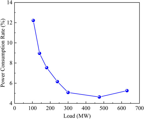 Figure 5 shows that with the decrease of unit load, the plant electricity consumption rate gradually increases. When the unit load decreases from 630 MW to 475 MW, the plant electricity rate decreases from 5.26% to 4.63%, the main reason is the improvement of boiler efficiency. When the unit load continues to decrease from 475 MW and the unit adopts sliding pressure operation, the boiler load decreases and the plant electricity consumption rate gradually increases. When the unit load is reduced to 300 MW, the plant electricity consumption rate increases to 5.08%. When the unit load is reduced to less than 300 MW, the power consumption rate of the plant increases significantly. When the unit load is reduced to 105 MW, the plant electricity rate rises to 12.22%, increasing by 7.14%. This is because when the load of the unit is low, the proportion of power consumption of the main auxiliary machinery increases significantly, resulting in a gradual increase in the power consumption rate of the unit plant.