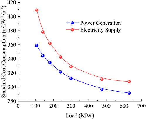 In the case of deep peak shaving of the unit, the deviation of the main engine and auxiliary machine from the designed operating condition leads to the decrease of efficiency, resulting in the increase of the power consumption rate of the unit (Wang et al., 2024). According to the measured data during the test, the power consumption of the plant, the standard coal consumption of power generation and the standard coal consumption of power supply are calculated. The variation curve of plant power consumption rate with unit load is shown in Figure 5, and the variation curve of standard coal consumption for power generation and standard coal consumption for power supply with unit load is shown in Figure 6.