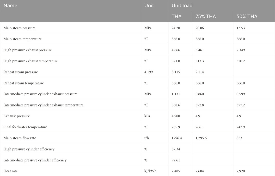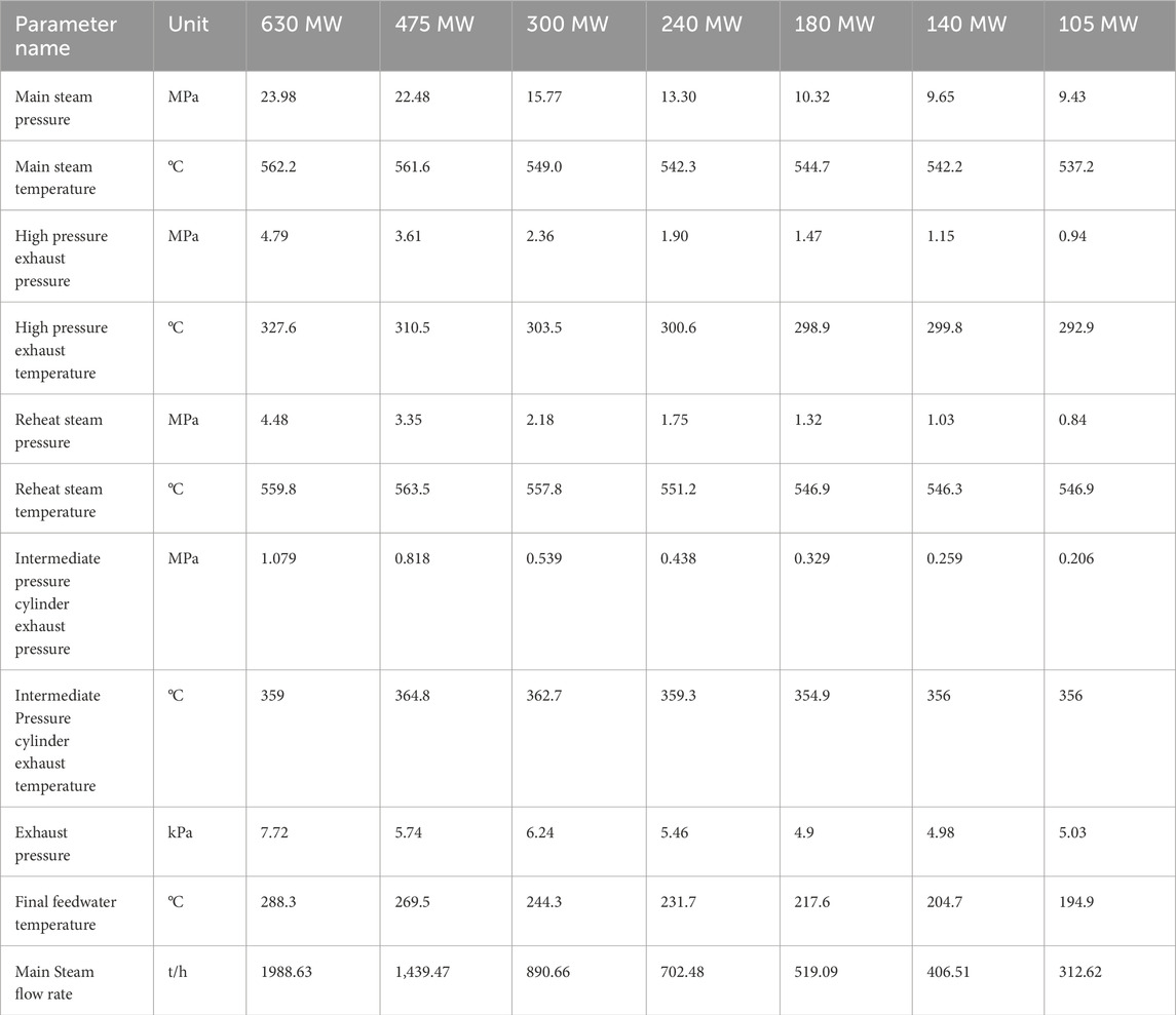 The level of unit load has a great influence on the heat rate of steam turbine (Huang et al., 2022). When operating at rated load, three high pressure regulating valves are fully open and one regulating valve is closed. When the load of the unit gradually decreases from the rated load, one regulating valve of the turbine is closed, and the opening degree of three regulating valves is gradually reduced. When the load of the unit is reduced to 180 MW, the two high-pressure regulating valves of the steam turbine are closed, and the opening of the two inlet regulating valves is small. As the load of the unit continues to decrease, the two high-pressure regulating valves of the steam turbine are closed, and the opening degree of the two inlet regulating valves continues to decrease. As the unit operation mode has a great impact on the economy, in this performance experiment, the unit load adjustment adopts the sliding pressure operation mode, and the operation parameters of the steam turbine under different loads are shown in Table 2.