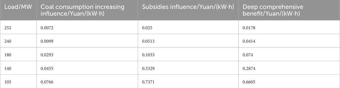 According to the test results in Figure 5, the coal consumption change of power supply in different intervals is analyzed according to the linear change. When the unit load is in the range of 240 MW–300 MW, the coal consumption increases by 1.44 g/(kW·h) when the load is reduced by 1%. When the load of the unit is in the range of 180 MW–240 MW, the coal consumption increases by 2.03 g/(kW·h) for each 1% reduction in load, and the corresponding cost is 0.0343 yuan/(kW·h). When the unit load is in the range of 140 MW–180 MW, the coal consumption increases by 2.56 g/(kW·h) for each 1% reduction in load. When the load of the unit is in the range of 105 MW–140 MW, the coal consumption increases by 5.58 g/(kW·h) for every 1% reduction in load. The comprehensive benefit of deep peak regulation is calculated, and the results are shown in Table 3. It can be seen from the table that when the coal price is 1,000 yuan/ton and the peak regulation service fee is subsidized according to the upper limit, the greater the depth of peak regulation, the greater the benefit.