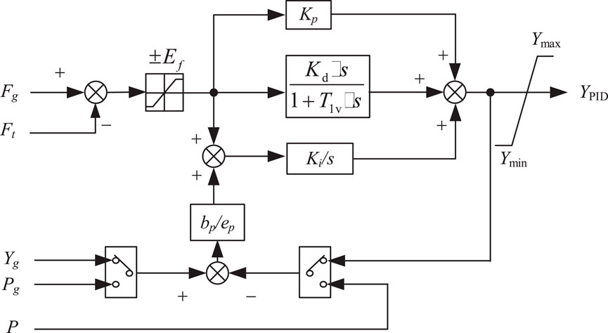 According to different control requirements, the governor has three operation modes under grid-connected conditions: frequency regulation, gate opening regulation, and power regulation. Frequency regulation is applied in no-load and isolated grid operation. Power regulation converts power deviation into flow setting through proportional-integral calculation to adjust turbine output power. Gate opening regulation is generally used in grid-connected operation. In high-head hydropower MMC-HVDC systems, gate opening regulation is prioritized because grid frequency stability is primarily maintained by the large interconnected AC system, allowing the hydro unit to focus on precise flow and torque control for optimal efficiency and rapid response during transient events. This mode also provides a more direct and measurable control input for parameter identification, reducing the influence of external grid frequency fluctuations and simplifying the modeling process. The turbine model established in this manuscript mainly focuses on gate opening regulation mode. While this choice enhances the accuracy and robustness of the identified parameters under typical grid-connected conditions, it should be noted that the model’s direct applicability to scenarios dominated by frequency or power regulation may require additional tuning of control loops to account for different feedback signals and operating objectives. The following figure shows the PID governor model of high-head turbine. In Figure 2, Kp is the proportional gain, Ki is the integral gain, and Kd is the derivative gain, T1v is the differential time constant, Ef is the artificial frequency dead zone, bp/ep is the permanent slip coefficient, YPID is the regulator output, Ymax, Ymin is the regulator output limiting, Ft is the machine frequency, Fg is the frequency given, Yg is the opening given, Pg is the power given, P is the unit power.