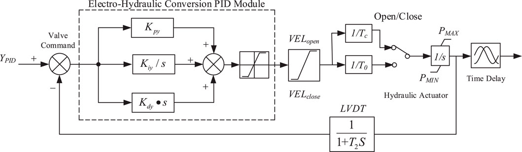To prevent water hammer effects, both the opening and closing speeds of the servomotor are subject to certain limitations, and the opening and closing rates are typically not identical. Additionally, for simulation modeling purposes, a first-order integral amplification component is sufficient to characterize the servomotor’s operational behaviour. Therefore, the servo system can be represented by the model illustrated in Figure 4. In Figure 4, Kpy, Kiy and Kdy represent proportional gain, integral gain and differential gain, respectively. VELopen and VELclose are the maximum opening speed and the maximum closing speed of the hydraulic servo motor, respectively. Tc and T0 represent the closing time constant of the hydraulic actuator and the opening time constant of the hydraulic actuator, respectively. Pmax and Pmin are the maximum output power of prime mover and the minimum output power of prime mover, respectively. T2 is the power delay time.