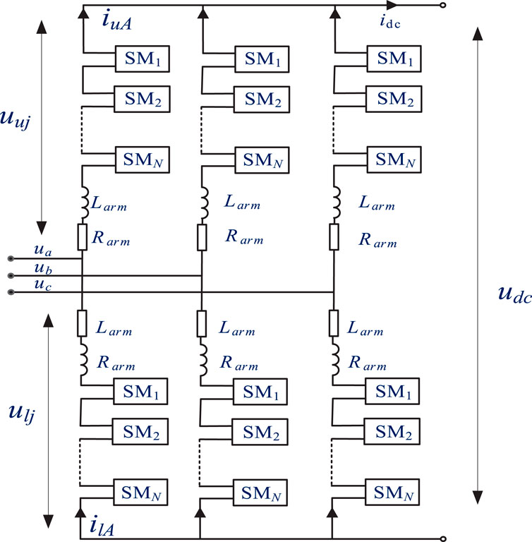 MMC-HVDC systems are capable of integrating and transmitting large-scale renewable energy and are therefore widely adopted in modern power systems. The main topology of MMC is shown in Figure 6. It includes six bridge arms. Each bridge arm contains N sub modules and the corresponding bridge arm resistance Rarm and bridge arm inductance Larm. In Figure 6, udc and idc represent DC voltage and DC current, respectively. Zgdc represents DC grid load impedance, and Zgac represents AC grid impedance.