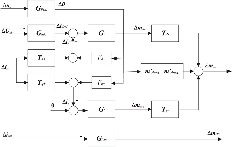 To facilitate modeling and analysis, the harmonic state-space (HSS) model of the MMC control system, which is linear and time-invariant, is presented in Figure 7.
