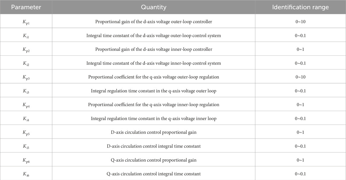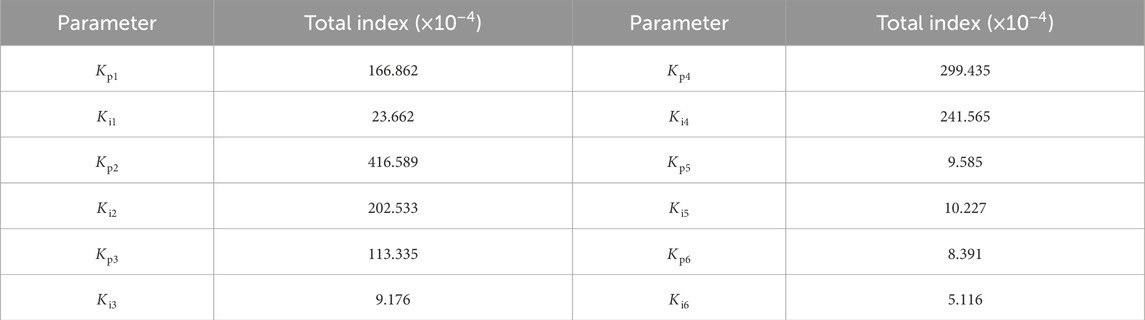 First, Sobol sensitivity analysis was conducted to determine the most influential parameters. Parameters within the MMC-HVDC control systems were selected as candidate sets based on their influence on system performance. The corresponding identification ranges for these candidates are provided in Table 2. Following the sensitivity analysis method detailed in Section 3, the total Sobol indices for these parameters were computed and are summarized in Table 3. It can be seen that Kp1, Kp2, Ki2, Kp3, Kp4 and Ki4 have higher sensitivity indexes compared with other parameters. Therefore, these six parameters are selected as the dominant parameters for the following identification.