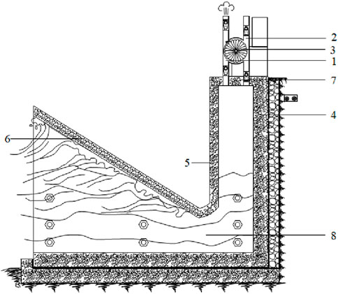 Figure 1. Cavity exhaust: 1, Exhaust pipe; 2, intake pipe; 3, turbine blades; 4, revetment chamber rear wall; 5, revetment chamber front wall; 6, advanced revetment plate; 7, revetment chamber top plate; 8, pressurized water channel.
