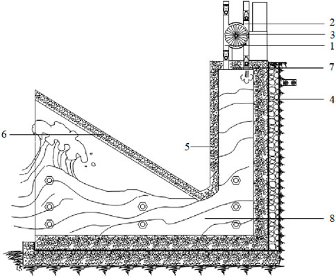 Figure 2. Cavity intake: 1, Exhaust pipe; 2, intake pipe; 3, turbine blades; 4, revetment chamber rear wall; 5, revetment chamber front wall; 6, advanced revetment plate; 7, revetment chamber top plate; 8, pressurized water channel.