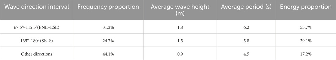 The wave energy distribution at Beihai Port widely varied among the wave direction intervals, with marked directional heterogeneity. The wave energy density was highest in the 67.5°–112.5° (ENE–ESE) wave direction, with an average wave height of 1.8 m, a frequency proportion of 31.2%, and an energy proportion of 53.7% (Falcão and Göteman, 2024). The wave energy density was second highest in the 135°–180° (SE–S) direction, with an average wave height of 1.5 m, a frequency proportion of 24.7%, and an energy proportion of 29.1%. The average wave height was 0.9 m, the combined frequency proportion was 4.5%, and the energy proportion was 17.2% for the other directions (Table 2) (Rusu E et al., 2024).
