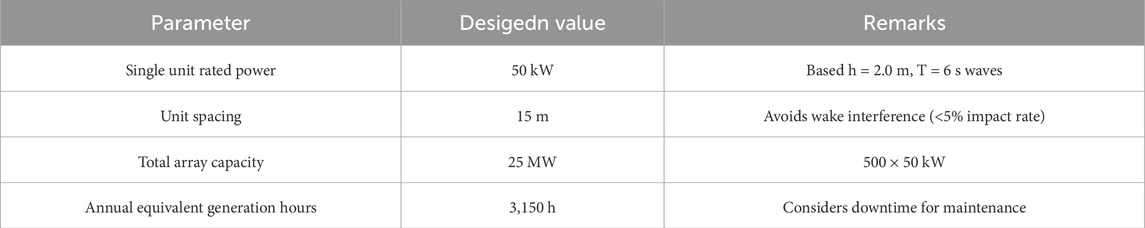 The power generated per unit Punit is 150 kW, total efficiency ηtotal is 0.126, and equivalent power generation hours teq is 3,150 h wit a 120 km coastline and N = 500 units deployed. The annual energy output is calculated as