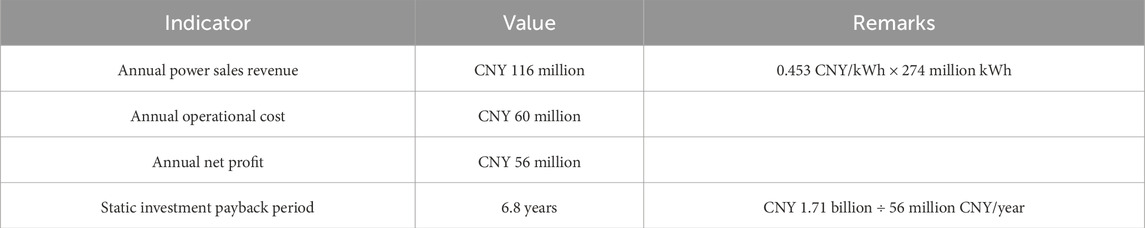 The obtained values are substituted into Equation 10 to calculate an the annual energy output Eannual o approximately 3.0 × 108 kWh, which is equivalent to 120,000 tons of standard coal, reducing CO2 emissions by 2.49 million tons and meeting the annual electricity needs of 160,000 households (Liu et al., 2024).