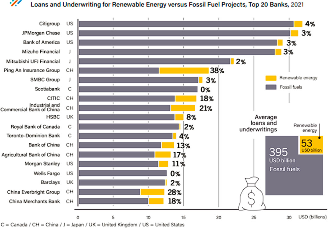 Figure 2. Loans and underwriting comparison for Fossil fuels and renewables (REN 21, 2023).