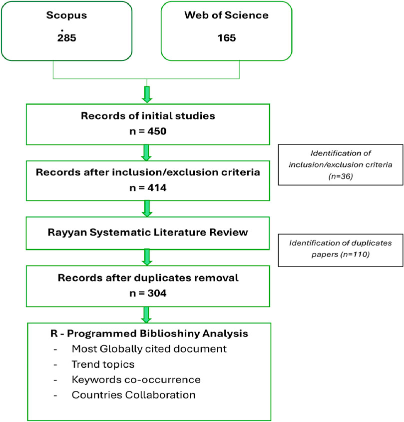 The analysis of the research documents in achieving the research objectives was done using two software, which are the Rayyan (http://www.rayyan.ai/) for Systematic Literature Review and R-Studio oriented Biblioshiny Analysis (https://www.bibliometrix.org/home/index.php/layout/biblioshiny). According to Valizadeh et al. (2022), the Rayyan is a web based automated screening tool used for Systematic Literature Review, as it helps the reviewers in screening research outputs. This study utilized the Rayyan software in screening research articles and abstracts, leading to exclusion of duplicated documents and research publications outside the inclusion criteria stated in Table 1. Moreover, the Bibliometric analysis was done using the Biblioshiny web application, which is built on R–programming language. According to Burkut (2023), Biblioshiny is a web application that provides an interface for Bibliometrix, which performs the logical and statistical science mapping of publications. Hence, this study follows the bibliometric analysis outlined in Farooq (2021) and David et al. (2023).
