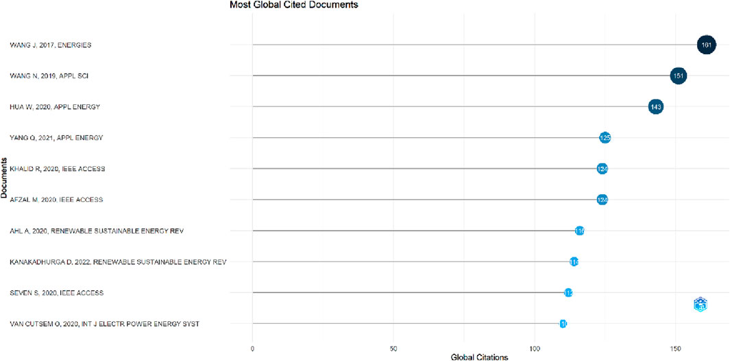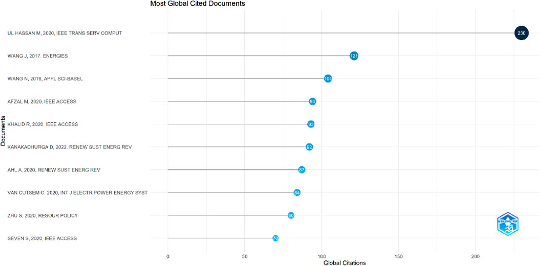 According to Figures 5, 6, the two most globally cited document on optimizing blockchain for renewable energy cost are Hassan et al. (2020) in their paper (DEAL: Differentially private auction for blockchain-based Microgrids Energy Trading) and the research of Wang et al. (2017) in their research paper (A Novel Electricity Transaction Mode of Microgrids Based on Blockchain and Continuous Double Auction).