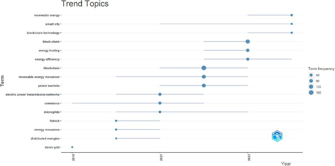 Moreover, the trending topics in Figures 7, 8 suggest that the evolving nature of Blockchain technology across all the phases (sources, generation, system, management, electric power transmission network, and energy efficiency) of renewable energy utilization in addressing cost issues, as evidenced in terms such as power markets, commerce, and energy trading. This further depicts the capability of the various features of blockchain technology to revolutionize the transactions and cost perspectives of renewable energy.