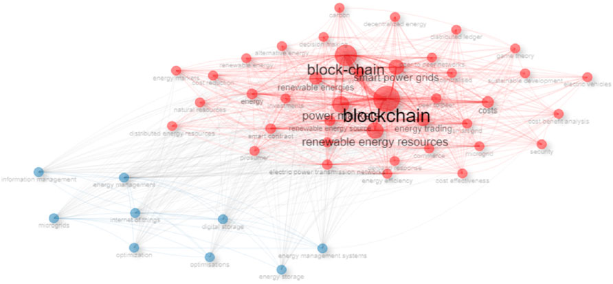 Figure 9 shows that there are two clusters for the intellectual interactions of keywords. The first cluster in red colour includes the following keywords: blockchain, block-chain, renewable energy resources, power markets, smart power grids, renewable energies, costs, energy trading, renewable energy source, electric power transmission networks, energy policy, energy, energy efficiency, smart contract, commerce, smart grid, energy utilization, microgrid, peer to peer, peer to peer networks, decentralized, renewable energy, alternative energy, energy markets, cost reduction, demand response, distributed ledger, decision making, cost effectiveness, investments, carbon, cost benefit analysis, game theory, security, decentralized energy, distributed energy resources, prosumer, sustainable development, electric vehicles, and natural resources. The second cluster in blue color includes the following keywords: energy management, Internet of things, microgrids, digital storage, information management, energy management systems, energy storage, optimisations and optimization.