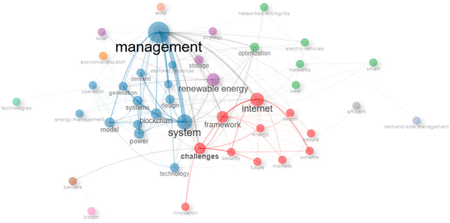 Furthermore, Figure 10 shows there are four major clusters and other keywords. The first cluster in red color entails Internet, challenges, frameworks, energy, security, scheme, future, markets, sector, secure, and innovation. The second blue cluster encompasses the keywords of management, system, blockchain, technology, model, systems, microgrids, power, demand, design, generation, market, energy management, operation, and demand response. The third cluster in green color includes keywords such as optimization, networks, electric vehicles, peer, smart, and networked microgrids. The fourth cluster includes keywords in orange: renewable energy, storage, strategy, and solar. The remaining keywords are economic dispatch, barriers, bitcoin, efficient, technologies, wind, and demand-side management.