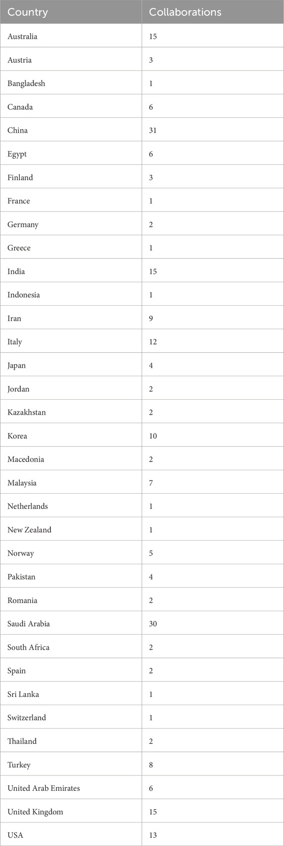 According to the statistics of collaboration, the top countries of collaboration with other countries in the Scopus database are shown in Table 3 and in Figure 11: