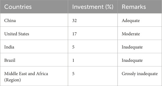 Given the collaboration dynamics as stated in Section 4, some countries have viable trade-in tariff models, making it easy for the investment in renewable energy to be attractive and profitable. Spain and China are regarded as the leading countries that recorded an appreciable amount of investment in exploring renewable energy solutions due to effective trade-in tariff policies (Ibrahim et al., 2021; Ming et al., 2013). Germany is also considered another country with a viable trade-in tariff strategy for renewable energy investment, which has led to the creation of 214,000 jobs and a reduction in acid rain as a result of greenhouse gas emission (Mendonca, 2007). Conversely, countries like United Kingdom, United States, and Japan currently have a mild trade-in tariff law for renewable energy solutions (Dong-Xiao et al., 2021). Similarly, most African countries are yet to embrace these frameworks, thereby making renewable energy solutions unattractive due to the high cost of implementation, which is evidently revealed in Tables 3, 4 of the countries with different collaborations. The list of countries with their corresponding investment in renewable energy solutions in 2018 is given in Table 5 and Figure 14 (Africa Energy Portal, 2019).