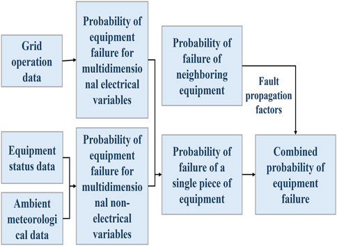 The primary current-carrying equipment in substations mainly includes cable lines, transformers, busbars, circuit breakers, and other related components. Accordingly, this study focuses on the safety status assessment of transformers, cable lines, and circuit breakers. From the perspective of both internal and external influencing factors, electrical variables and non electrical variables representing the operational status of power system and equipment are key indicators of potential failures. These factors are interdependent, and anomalies in any of them warrant close attention (Xie and Xu, 2024). To capture this complexity, a series model is developed for individual equipment, integrating multi dimensional electrical and non-electrical variables into a unified failure probability function. Additionally, the model incorporates fault propagation probability between adjacent devices, resulting in a comprehensive estimation of overall equipment failure probability.