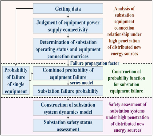 The progress begins by analyzing real time substation monitoring data to determine the direction of power flow and the supply status of each device, thereby identifying the substation’s operating state. Based on this, the internal connection topology of the equipment under current operating conditions is analyzed to construct the equipment connectivity matrix. Then, by integrating the connectivity relationships and intrinsic multidimensional variables of individual devices, the failure probability functions of single equipment are established. These are further aggregated using a series system model to derive the overall failure probability of the substation system, which quantitatively reflects substation’s safety status and enables classification into safety levels. Finally, a substation system dynamics model is developed to evaluate the safety status of the substation under varying operational and environmental conditions.