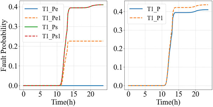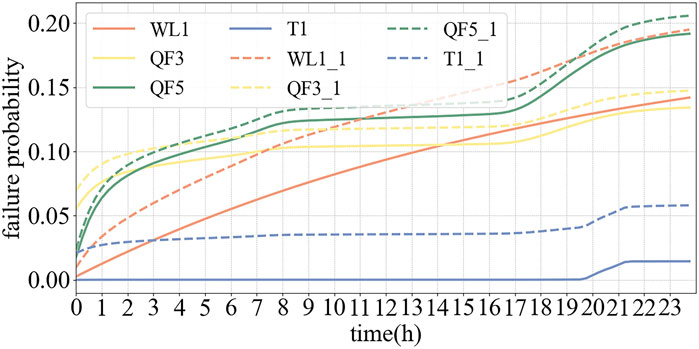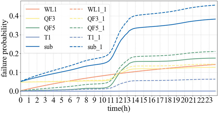 Taking transformer T1 as an example, the net load curve exhibits a typical “duck curve” (Denholm et al., 2015). The monitoring data sampled at 15 min intervals as described above are input into the system dynamics model. Based on the direction of the power flow and the associated fault propagation probabilities, the failure probability of individual equipment and the substation system are computed, as shown in Figure 8.