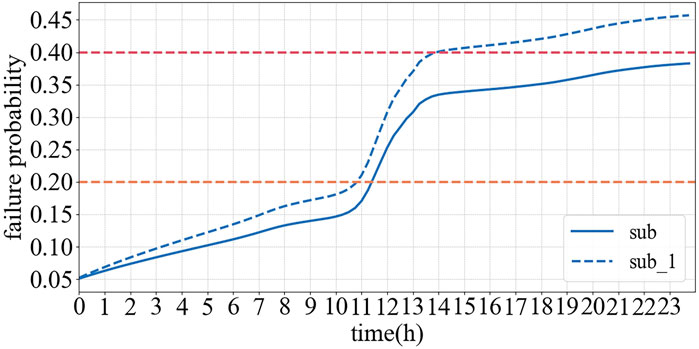 In Figures 8, 9, the dotted lines represent the aggregated failure probability of a single device and the substation, considering the correlation between different devices. It is observed that the comprehensive failure probability accounting for the failures propagation among interconnected components is notably higher than the failure probability calculated for single equipment in isolation.