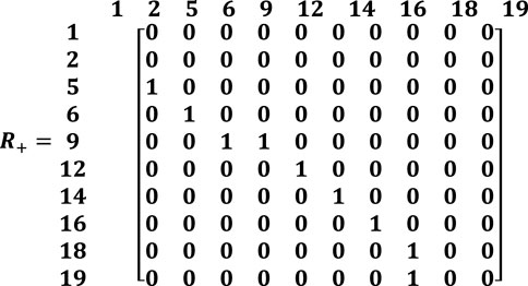 In this study, faults in adjacent equipment are assumed to have a stronger mutual influence, thus, the weight of fault propagation between neighboring equipment are assigned higher values. According to the value of the reachable matrix, the value of the fault propagation probability matrix is derived, as expressed by the following Equation 37.