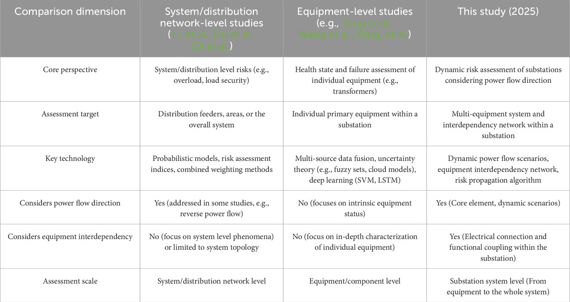 Existing methods still suffer from two main shortcomings: Firstly, they fail to dynamically couple the key characteristic of uncertainty in power flow direction—driven by renewable energy fluctuations in the new power system—with the electrical connection relationships of equipment within the substation. Secondly, there is a lack of an assessment framework capable of quantifying the risk propagation effects arising from functional coupling between equipment at an integrated, system wide level. Table 1 presents a comparison between the proposed method and prior studies.