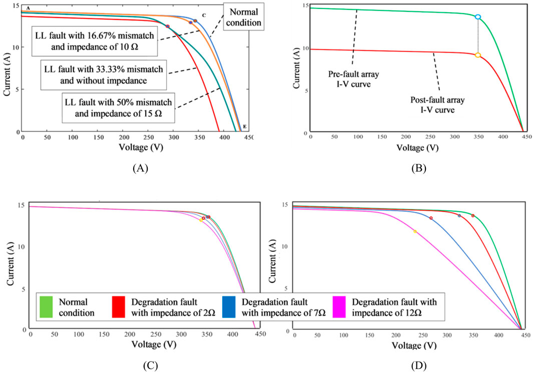 Figure 2. (A) The impact of different mismatch levels and fault impedance on I-V curve during an LL fault (B) The impact of an open-circuit fault on the I-V curve (C) A degradation fault in a string (D) A degradation fault in the whole array.