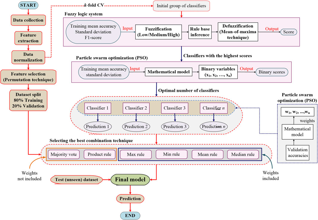Next, a group of classifiers are arbitrarily selected and trained using the whole normalized dataset. To initially select the best classifiers, each individual classifier is assigned a score using fuzzy logic (FL) system based on the classifier training mean accuracy, standard deviation, and F1-score and the classifiers with the highest scores are nominated. After that, the particle swarm optimization (PSO) technique determines the optimal number of classifiers through a binary (0 or 1) classification. In the meanwhile, the permutation feature selection technique is applied to the normalized dataset to select only the most effective features and reduce the dataset dimensionality. The dataset is then split into training subsets with 80% and validation subset with 20% of the whole dataset. To combine the prediction of each individual classifier, various combination techniques, such as min rule, max rule, product rule, mean rule, median rule, and majority vote rule are tested and finally the best technique is ascertained. To produce a more accurate final result, PSO technique is again employed to assign and optimize weights for specific combination techniques, namely min rule, max rule, mean rule, and median rule. In the end, the finally created model is further evaluated using an test (unseen) dataset.