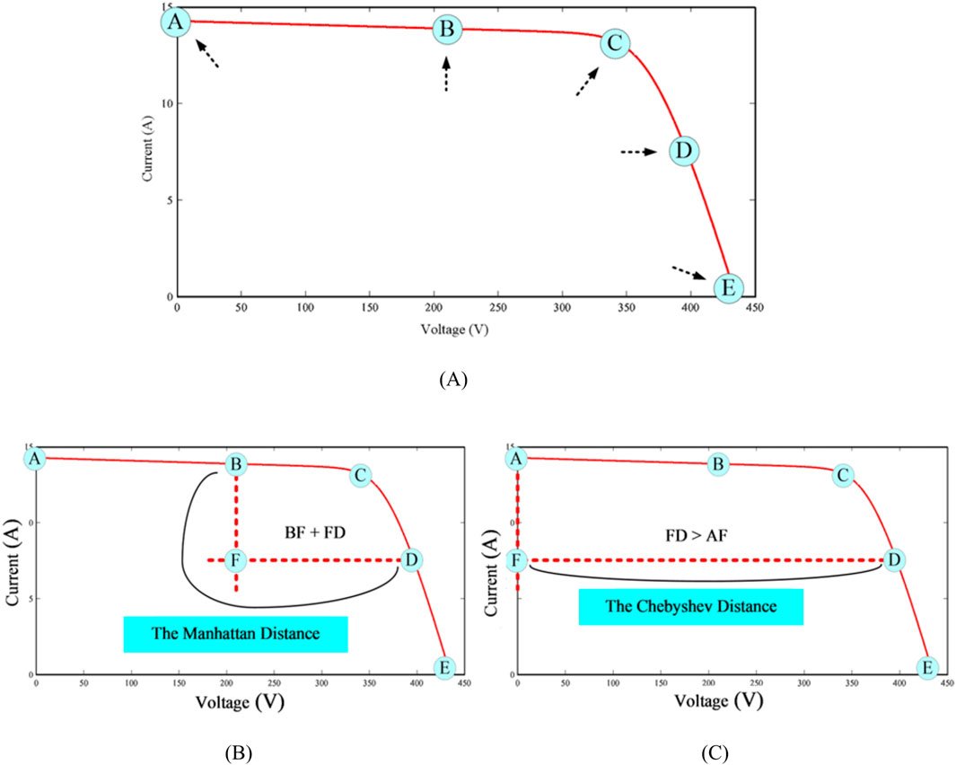 Figure 4. (A) Pre-defined points on a PV array I-V curve to construct the initial dataset (B) Example of Manhattan distance technique in feature extraction process (C) Example of Chebyshev distance technique in feature extraction process.