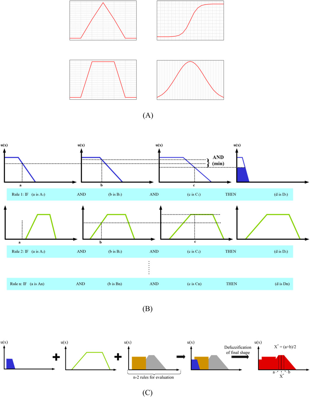 Figure 5. (A) Several fuzzy logic membership functions: triangular, sigmoid, trapezoidal, and gaussian (B) Evaluation of rules in the process of inferencing (C) Aggregation of rules and defuzzification of final shape.
